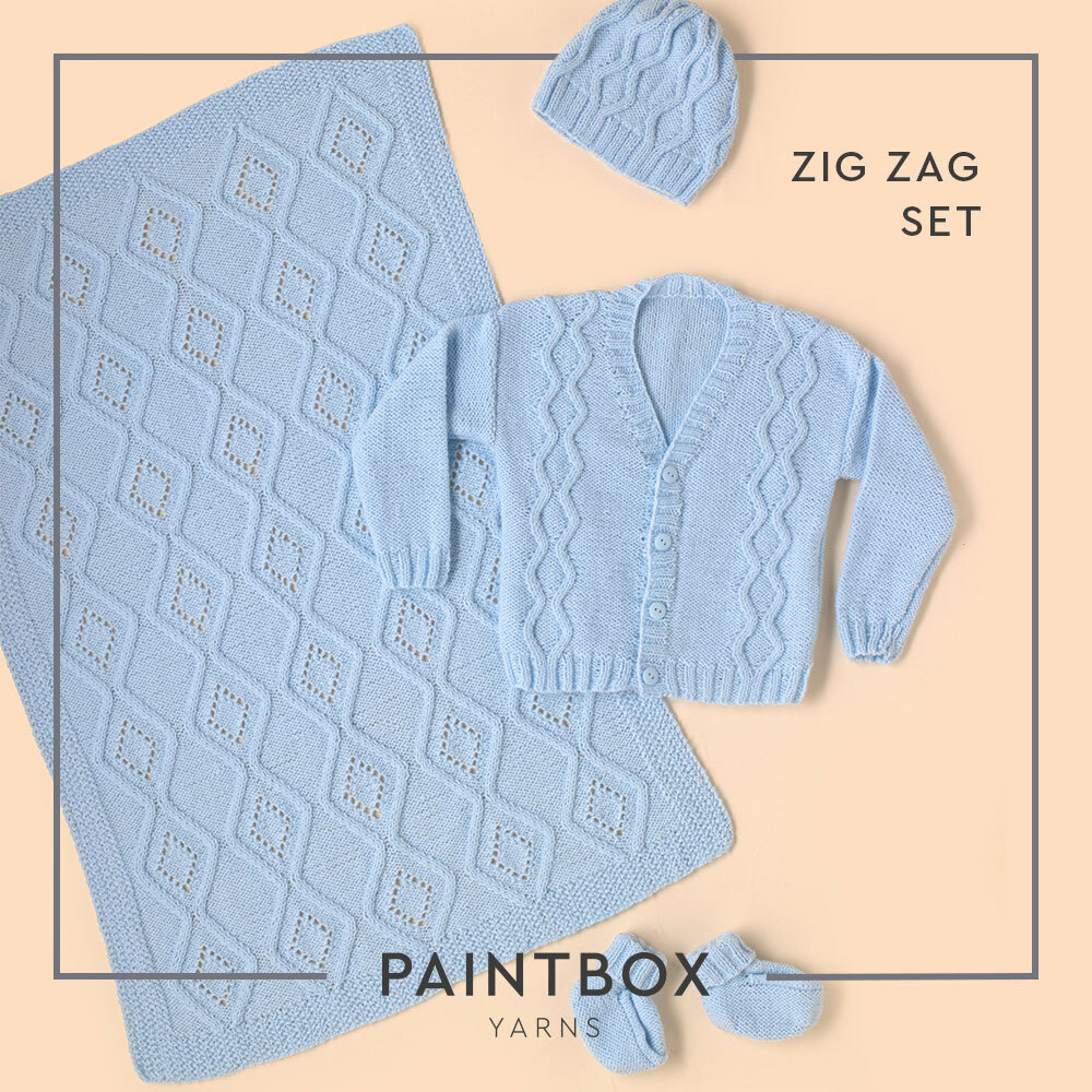 Pattern: Zig-Zag Set (Free pattern on LoveCrafts) https://www.lovecrafts.com/en-gb/p/zig-zag-set-free-accessory-knitting-pattern-accessory-knitting-pattern-in-paintbox-yarns-baby-dk
